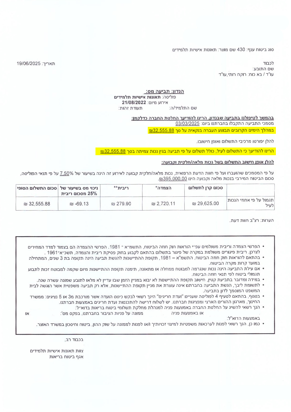 לקוח שנפגע בתאונת אופנוע פנה למשרדנו. כתוצאה מהתאונה נותרה לו מגבלה קלה בלבד וצלקת. במסגרת הטיפול בתיק, התייעץ משרדנו עם מומחה רפואי לצורך הערכת שיעור הנכות, על מנת לוודא כי הפיצוי שייפסק ישקף באופן מלא והוגן את המגבלה שנותרה. לאחר ליווי משפטי צמוד ונחוש, השיג משרדנו עבור הלקוח פיצוי כספי גבוה, לשביעות רצונו המלאה.