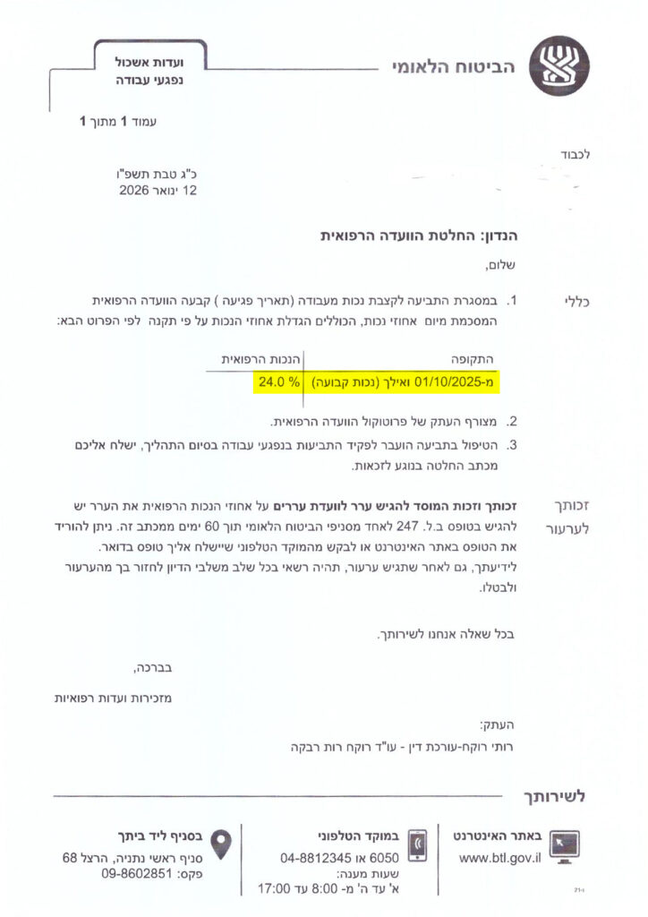 אדם שנפגע במהלך העבודה ונקבעה לו נכות זמנית או קבועה, זכאי לקבלת קצבה מביטוח לאומי. במקרה שטיפלנו בו, הלקוח שלנו החליק במדרגות במקום עבודתו ושבר את הכתף. ליווינו אותו בתהליך ההכרה מול ביטוח לאומי כנפגע עבודה, וכן בוועדות נכות, הגענו מצוידים במסמכים רפואיים ובחוות דעת רפואית ממומחה, ומקסמנו את הזכויות המגיעות לו עד לקבלת קצבה קבועה. הניסיון והמקצועיות שלנו מבטיחים תוצאה אמיתית ושקט נפשי ללקוח.